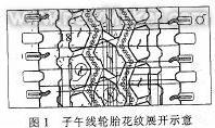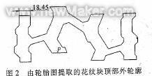 圖1為11R22.5LM516型輪胎花紋展開圖,為表示清楚,圖中僅標注了一個尺寸。由輪胎花紋展開圖提取出花紋塊的輪廓時,需要根據展開圖中花紋溝槽的尺寸及結構確定花紋塊的頂部、側壁和底部尺寸。