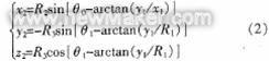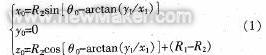 圖4c為點Po′繞x軸彎曲到點P′時的坐標變換情況,此時輪胎周向弧長保持不變刀,θ1的弧度值為y1/R3,故P′的坐標為: