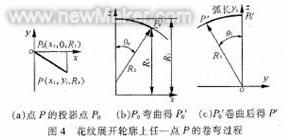 設胎頂半徑為R1,行駛面斷面的半徑為R2,則在oxyz坐標系中平面輪廓上任一點可記為P(x1,y1,R1)。圖4為等長卷彎過程中P點的變化情況。圖4a為沿z軸負方向觀察時的平面圖,P在xoz平面上的投影為Po(x1,O,Rl)。圖4b為P點繞y′軸旋轉時的坐標變化情況,此時花紋展開輪廓的曲線長保持不變,它在胎頂回轉面上的長度等于oPo,故θ0的弧度為x1/R1,從而Po′點的坐標為: