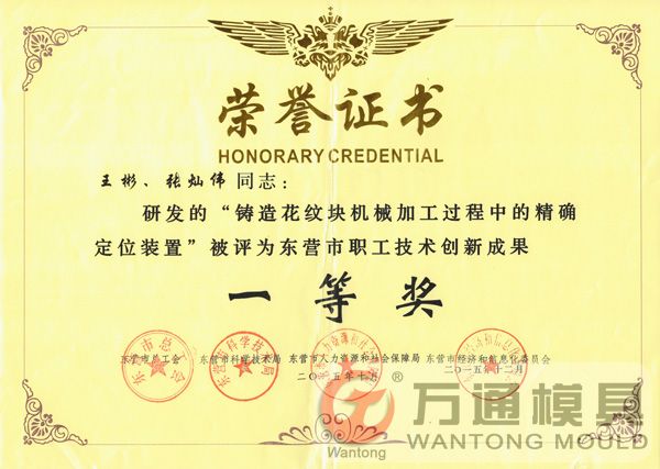 王彬、張燦偉研發的“鑄造花紋塊機械加工過程中的精確定位裝置”被評為東營市職工技術創新成果,一等獎。