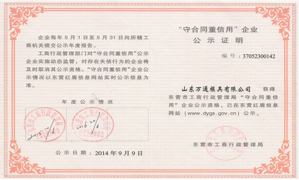 近日,經山東省東營市工商行政管理局審核批準,山東萬通模具有限公司再度獲得“守合同重信用企業”榮譽稱號。公司已連續三年獲此殊榮,憑借公司強大的實力和始終如一的卓越服務,再次得到行業與社會的認可。